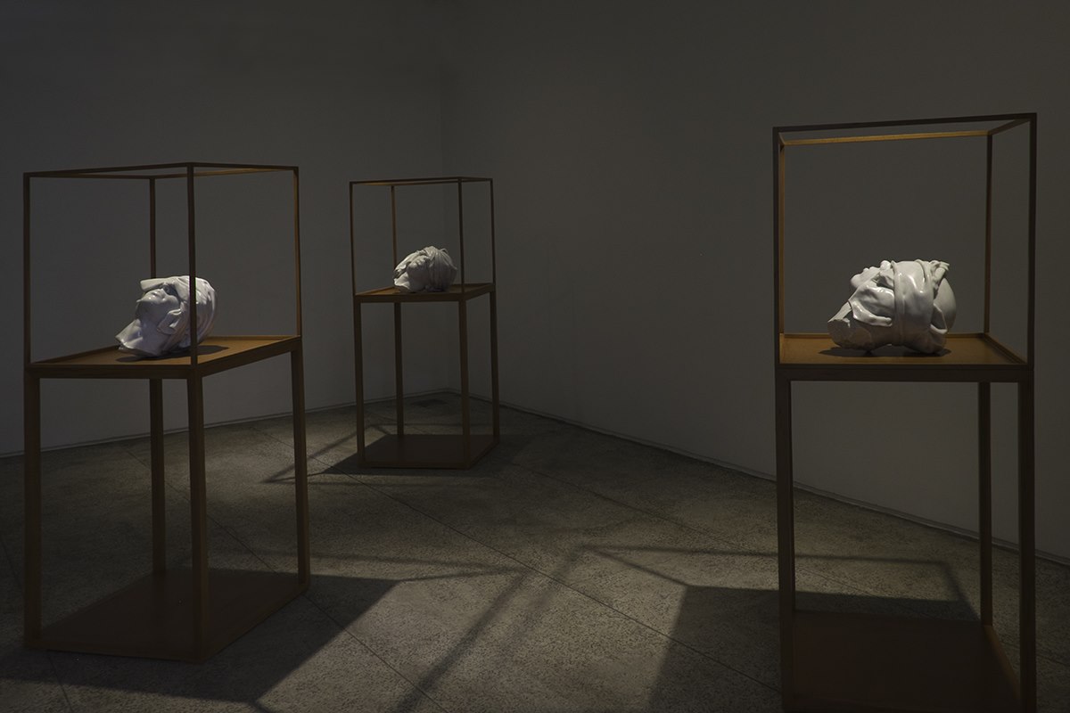 Hand carved, polished Carrara marble, vitrine Head: 45 cm x 25 cm x 25 cm Vitrine: 175 x 70 x 70 cm Location: solo show exhibition at Ab Anbar Gallery, Tehran, Iran, 2016